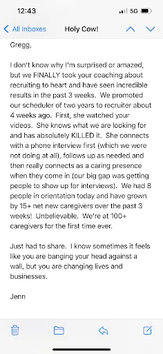ESPECIALLY when you consider that not having your recruiting and retention processes dialed in is likely costing your business tens (or even hundreds) of thousands of dollars in overtime pay, turning away cases you’re not able to take on, and an inability to predictably scale your home care business.
